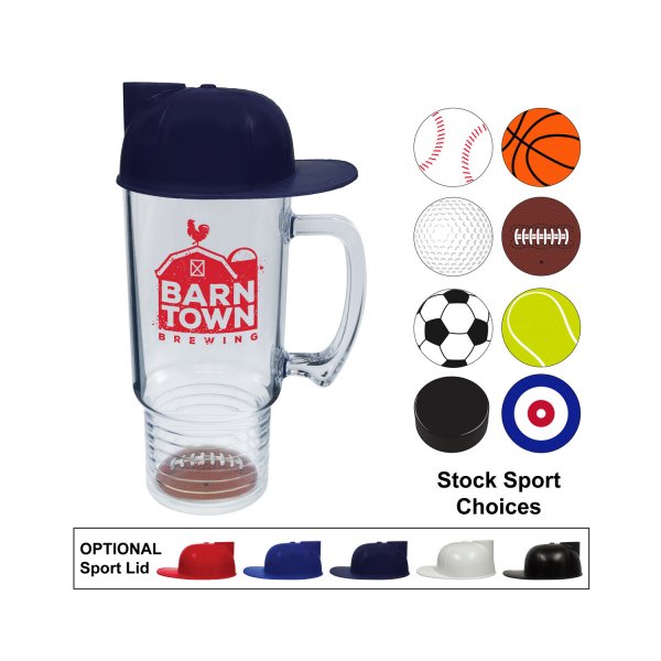 Energize your promotions with the 18 oz Plastic Sports Mug — proudly made in the USA from rugged, crystal-clear Styrene plastic. Designed for fun and function, each mug features a printed ball in the base for a playful twist that entertains with every sip. It’s shaped to fit standard cup holders and perfect for sports-themed restaurants, parties, tournaments, and high-energy brand events. Your custom logo, message, or slogan is boldly displayed on the generous imprint area for repeat visibility. Prices include your choice of 7 stock sports themes — Baseball, Basketball, Football, Tennis, Golf, Curling, or Soccer — with the option to add a fun, hat-shaped sport lid for extra flair. Also available in 12 oz, 16 oz, 18 oz, and 20 oz sizes