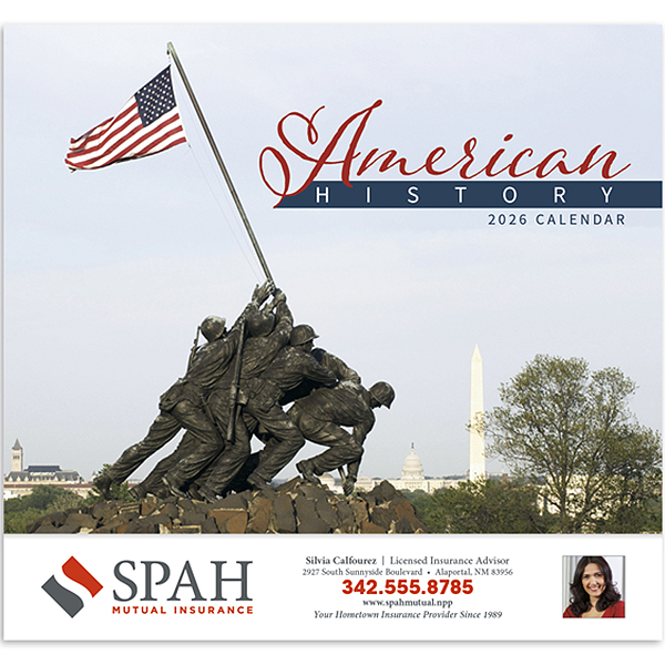 Celebrate the history of America with the American History Appointment Calendar. Featuring iconic moments and figures from American history, this calendar offers a glimpse into the past that inspires the future. Keep track of your schedule with plenty of space for notes, reminders, and appointments. Perfect for promoting your business, your business name, slogan, message, or logo will be displayed on each page, providing year-round exposure. Includes holidays and moon phases. This 13-month calendar includes December on the back mount.