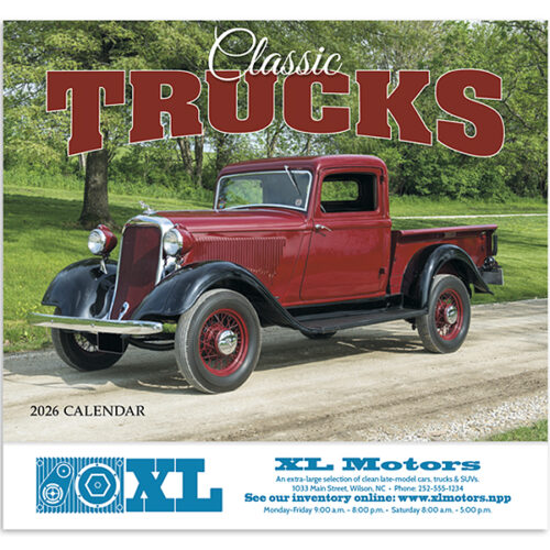 Celebrate the power and beauty of classic American trucks with the Classic Trucks Appointment Calendar, featuring iconic vehicles from the golden age of trucking. Stay organized with plenty of space for notes, reminders, and appointments. A great way to promote your business, your business name, slogan, message, or logo is prominently featured on each page for year-round visibility. Includes holidays and moon phases. This 13-month calendar includes December on the back mount. Also available in spiral style.