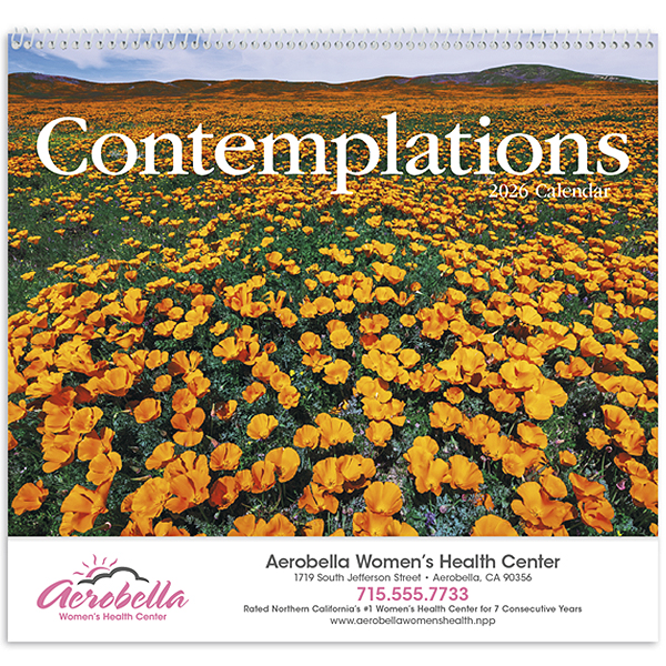 Find inspiration in every month with the Contemplations Appointment Calendar, offering thoughtful quotes and tranquil images for reflection. Keep your schedule on track with ample room for notes, appointments, and reminders. An ideal branding tool, your business name, slogan, message, or logo is displayed on each page, ensuring visibility year-round. Spiral-bound for easy flipping and includes holidays and moon phases. This 13 month calendar includes December on the back mount. Also available in stapled style.