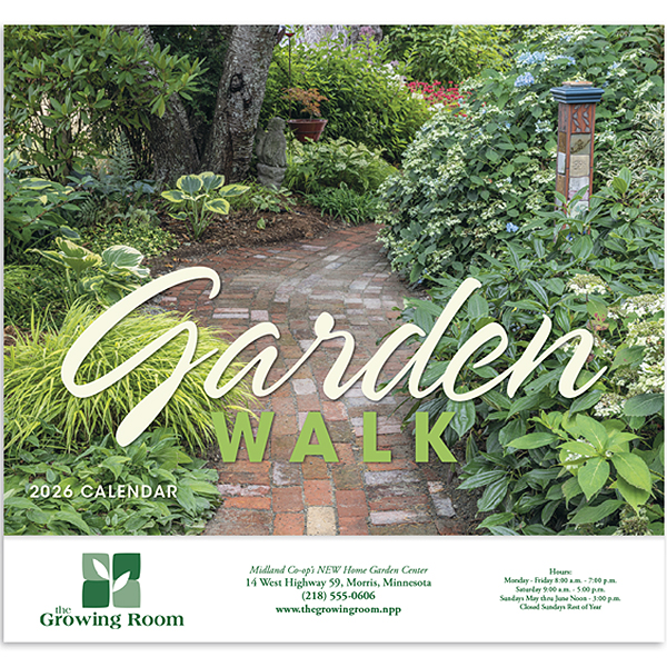 Celebrate the beauty of nature with the Garden Walk calendar. Each month offers vibrant imagery of blooming gardens that bring the serenity of the outdoors into your space. Printed on high-quality gloss paper with a UV-coated cover, this 13-month calendar includes December on the backmount for your planning convenience. The price includes a 1-color imprint in one location, allowing your business name, message, slogan, or logo to shine throughout the year. Also available in stapled and window style.