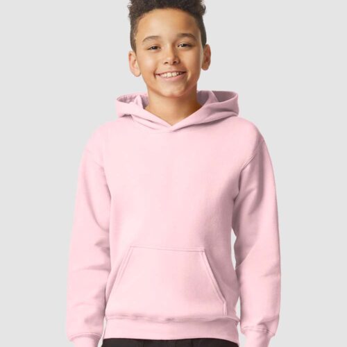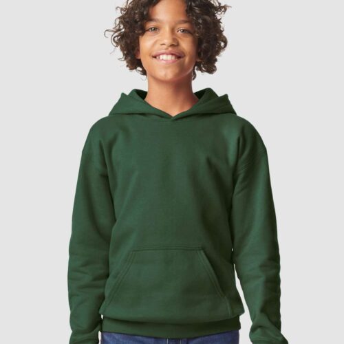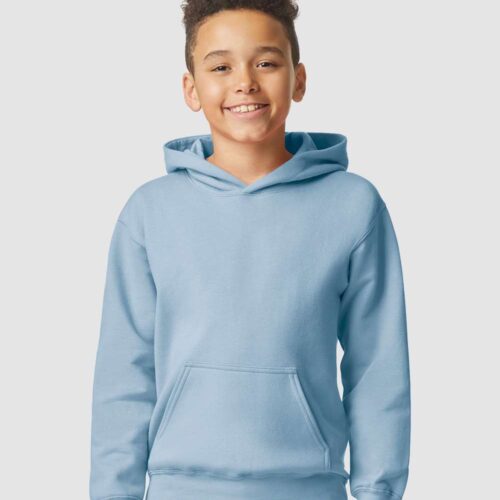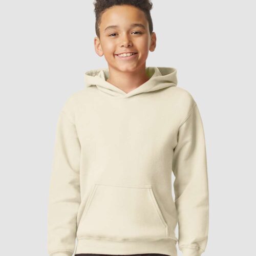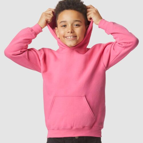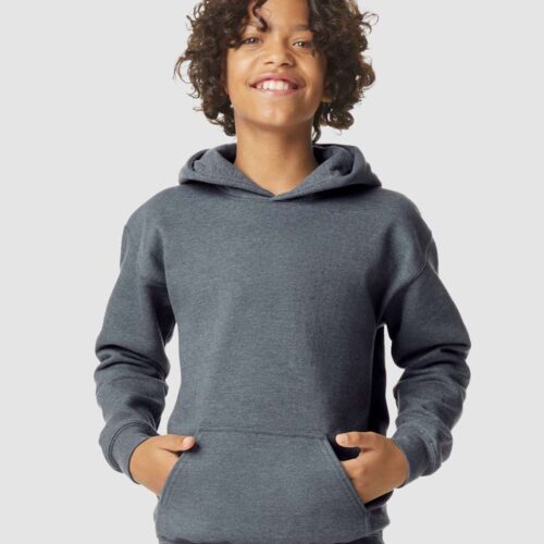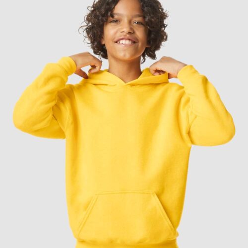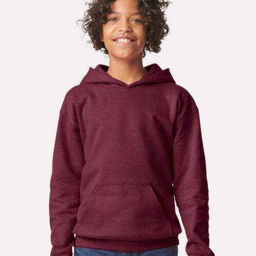 The Gildan Youth Softstyle® Midweight Hooded Sweatshirt delivers premium softness and dependable durability with its 8.4 oz. fleece construction, placing it in the midweight category ideal for year-round comfort. Made from an 80/20 ring-spun cotton/polyester blend with a 100% ring-spun cotton face and 20 singles yarns, this hoodie provides a soft, breathable feel while maintaining the strength needed for active youth wear. Dark Heather features a 50/50 cotton/polyester blend and Sport Grey is 75/25 cotton/polyester. The Softstyle® midweight fleece includes a cozy brushed interior and a smooth cotton face, creating an excellent printing surface that allows your school logo, team mascot, club name, or event design to appear bold, sharp, and professional.