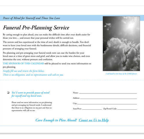 Celebrate the divine with the God’s Gift calendar. Each month features inspiring images and messages that reflect the beauty of faith and includes a Funeral Pre-Planning sheet. Printed on high-quality gloss paper with a durable UV-coated cover, this 13-month calendar includes December printed on the backmount for your planning convenience. The price includes a 1-color imprint in one location, allowing your business name, message, slogan, or logo to shine throughout the year.