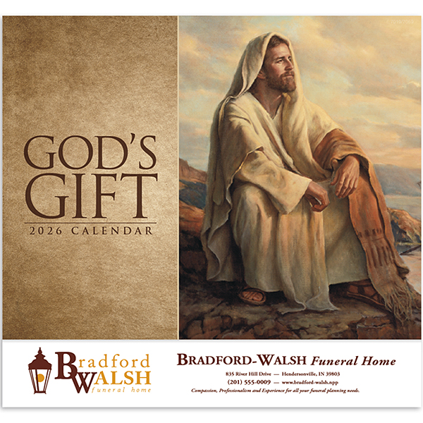 Celebrate the blessings of life with the God’s Gift calendar. Each month features inspirational images and messages that remind us of the beauty and grace around us. Printed on high-quality gloss paper with a durable UV-coated cover, this 13-month calendar includes December for your planning needs. The price features a 1-color imprint in one location, allowing your business name, message, slogan, or logo to shine throughout the year..