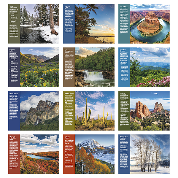 Promote wellness and a balanced lifestyle with the “Healthy Living” calendar. Each month features inspirational tips, healthy recipes, and vibrant images that encourage healthy habits. This 13-month calendar includes December on the back mount and is printed on premium gloss paper stock with a UV-coated cover for a sleek finish. The price includes a 1-color imprint in one location, making it an excellent resource for health-focused businesses and organizations. Also available in stapled and spiral style.