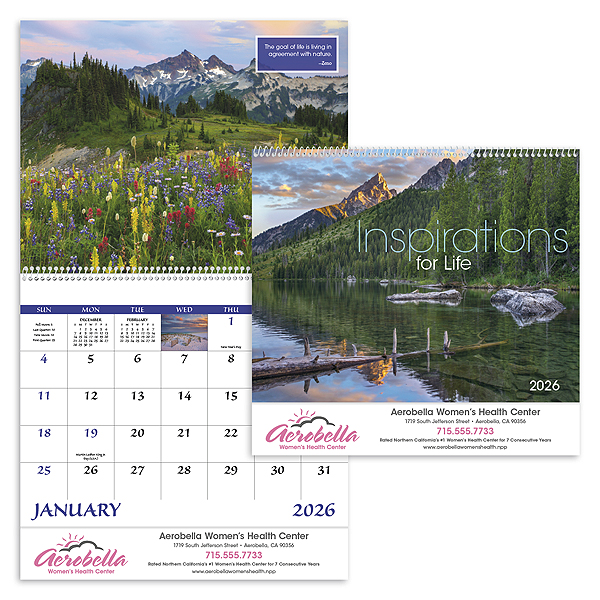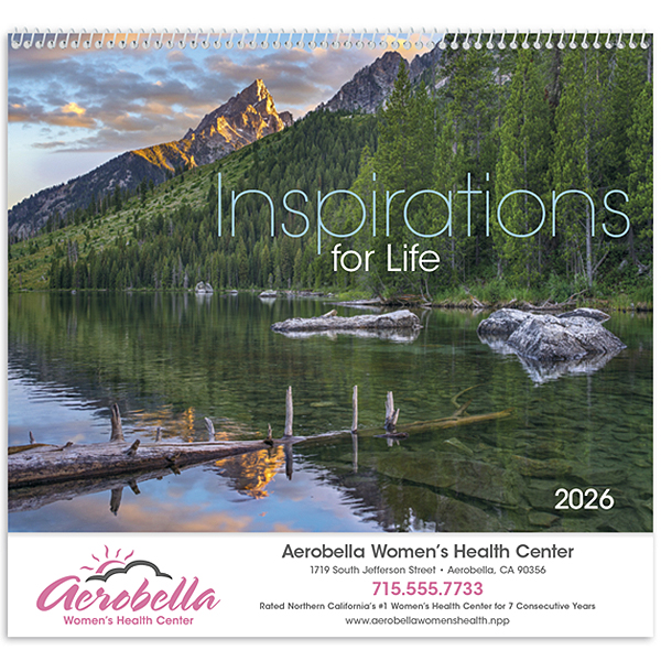 Encourage positivity and motivation with the “Inspirations for Life” calendar. Each month features uplifting quotes and beautiful imagery designed to inspire and empower your customers. This 13-month calendar includes December on the back mount and is printed on premium gloss paper stock with a UV-coated cover for a refined finish. The price includes a 1-color imprint in one location, making it a perfect gift for businesses looking to foster a positive environment. Also available in stapled and window style.