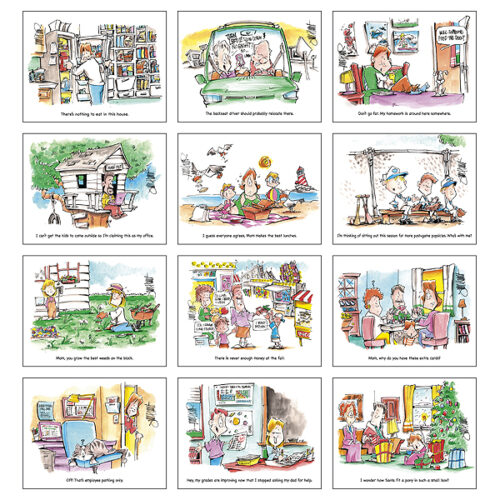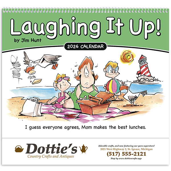 Delight in the laughter of the Laughing It Up calendar. Each month features humorous illustrations and quotes that will brighten your day. Printed on high-quality gloss paper with a durable UV-coated cover, this 13-month calendar includes December for your planning needs. The price features a 1-color imprint in one location, allowing your business name, message, slogan, or logo to shine throughout the year. Also available in stapled style.