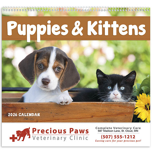 Brighten your year with the Puppies & Kittens calendar. Each month features adorable photos of playful puppies and cuddly kittens that are sure to melt your heart. Printed on high-quality gloss paper with a durable UV-coated cover, this 13-month calendar includes December for your planning convenience. The price includes a 1-color imprint in one location, allowing your business name, message, slogan, or logo to shine throughout the year. Also available in stapled, window and mini style.