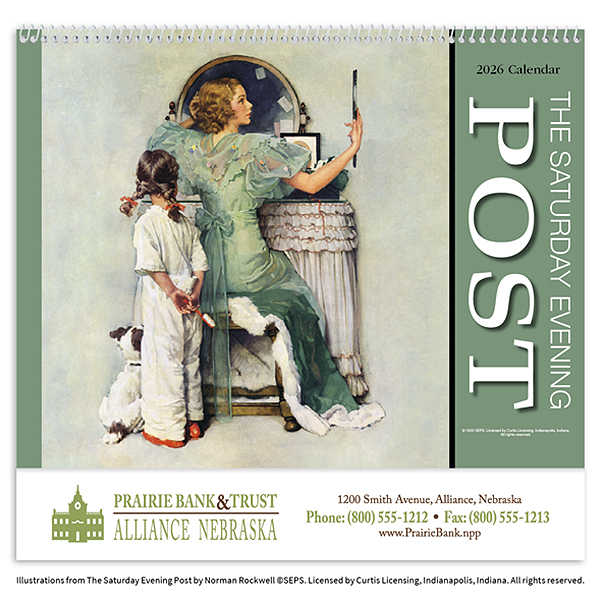 Enjoy classic American illustrations with the Saturday Evening Post Appointment Calendar, featuring nostalgic artwork from Norman Rockwell, in a bygone era. Track your days with plenty of room for jotting down appointments, events, and reminders. A wonderful promotional piece, your business name, slogan, message, or logo is clearly visible on each page, helping your brand stand out year-round. Spiral-bound for easy flipping and includes holidays and moon phases. This 13 month calendar includes December on the back mount. Also available in stapled style.