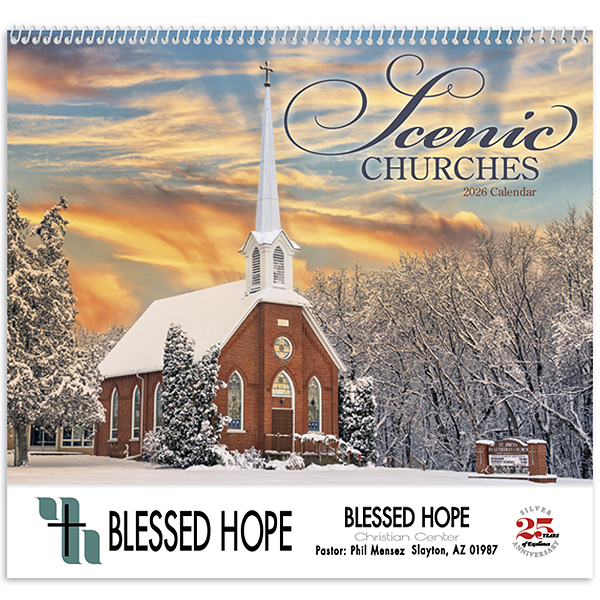 Discover stunning architecture with the Scenic Churches calendar. Each month features beautiful images of churches from around the world, showcasing their design and history. Printed on premium gloss paper with a UV-coated cover, this 13-month calendar includes December for your planning needs. The price features a 1-color imprint in one location, allowing your business name, message, slogan, or logo to shine throughout the year. Also available in stapled style.
