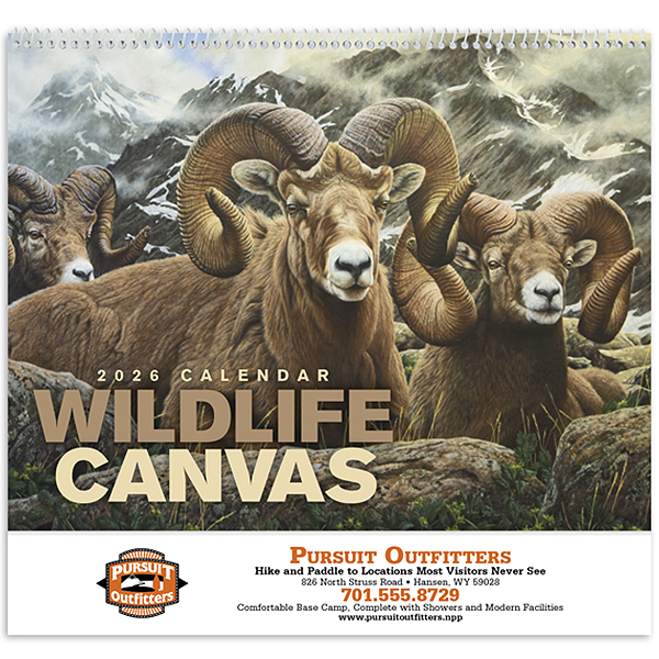 Capture the beauty of nature with the Wildlife Canvas calendar. Each month features stunning wildlife photography that showcases the diversity of nature. Printed on high-quality gloss paper with a durable UV-coated cover, this 13-month calendar includes December for your planning needs. The price features a 1-color imprint in one location, allowing your business name, message, slogan, or logo to shine throughout the year. Also available in stapled style.
